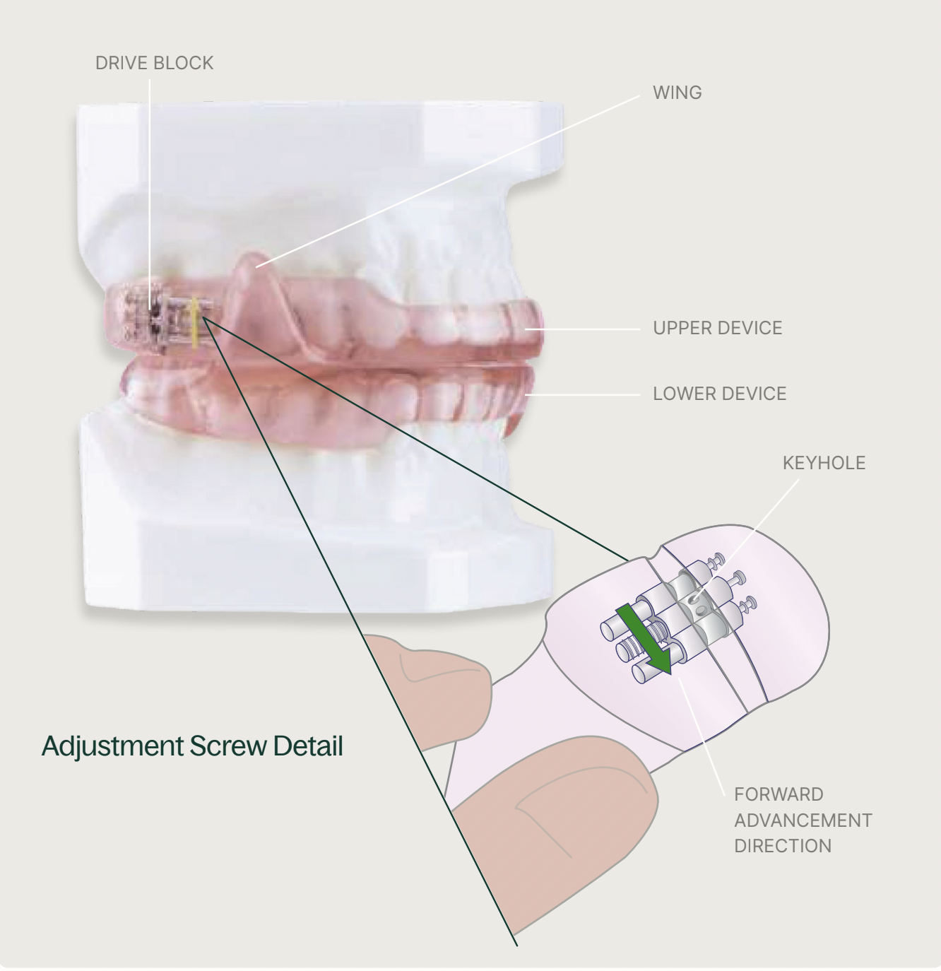 The Adjustable Herbst device uses a two-piece construction for snoring and obstructive sleep apnea treatment.