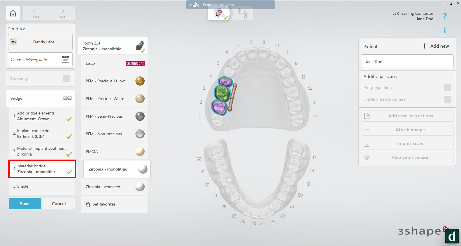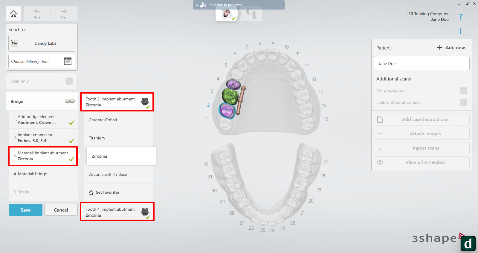 - Material Selection: Navigate to "Material: implant abutment" and pick your preferred material from the dropdown menu for each abutment. Select "Material: bridge" to choose your preferred bridge material from the drowndown menu.