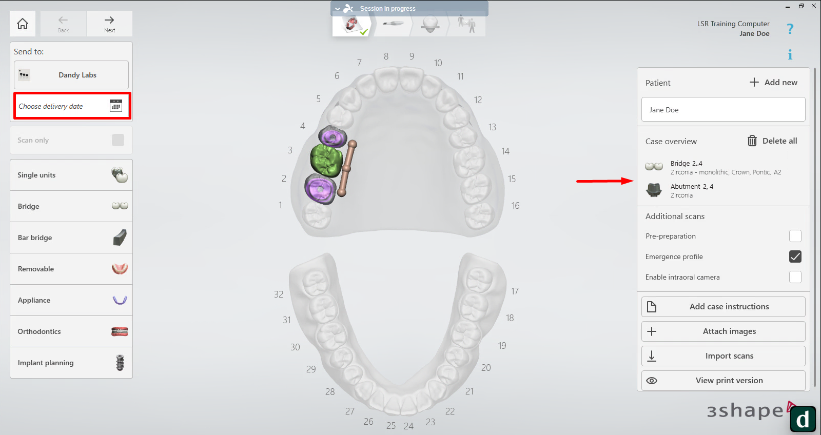 - Emergence Profile Scan Selection: An emergence profile scan should be automatically selected and is necessary to submit and complete an implant case with Dandy. Ensure that the "Emergence profile" box is checked in the case overview box on the right side of the screen.