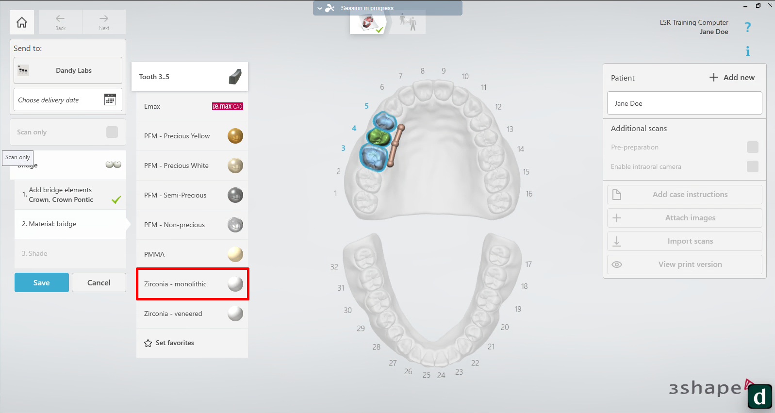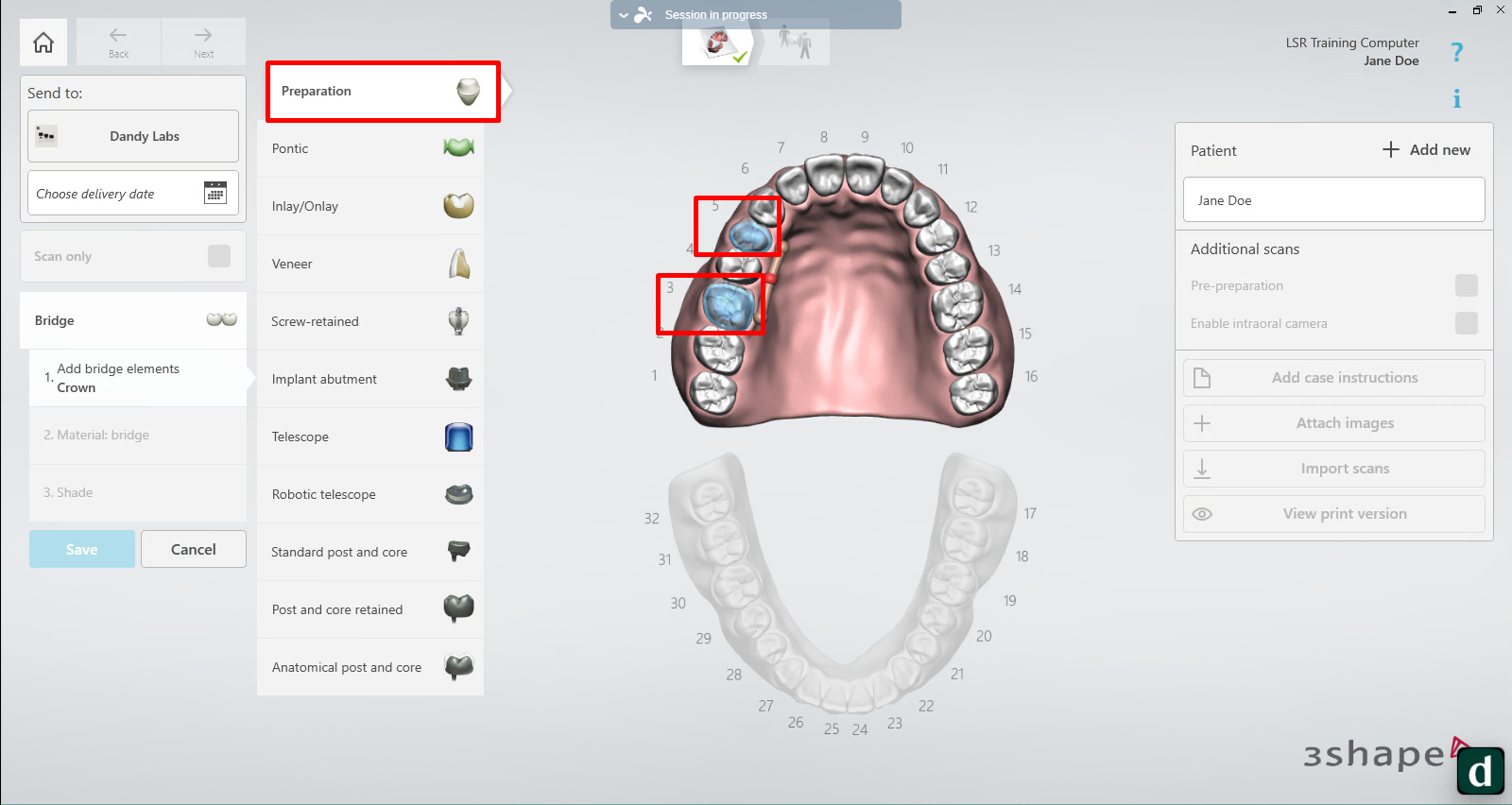 - Case Type: Select "Bridge" and "Preparation." Choose the teeth that will serve as abutments. Lastly, select "Pontic," then the pontic tooth or teeth.
