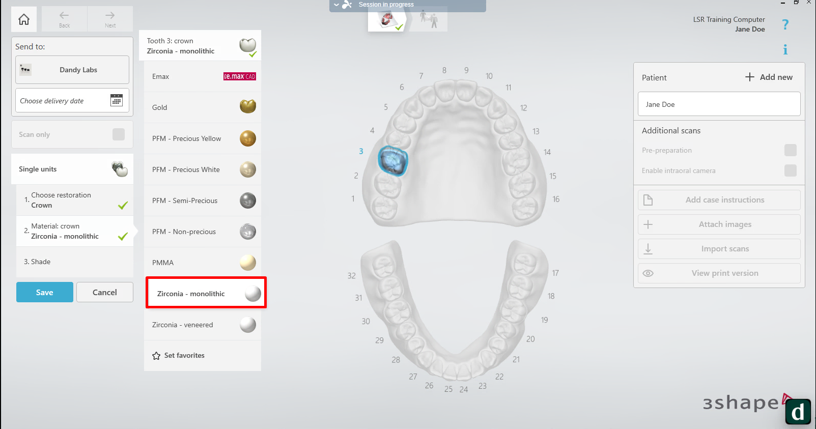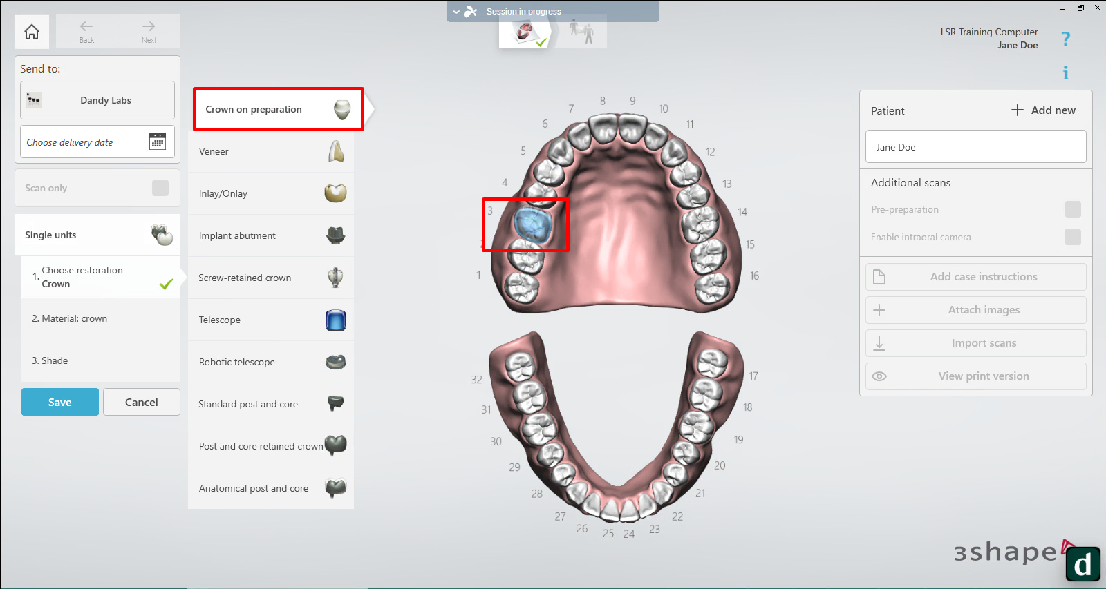 - Case Type: Select "Single Units" and "Crown on Preparation." Choose the tooth that requires treatment.