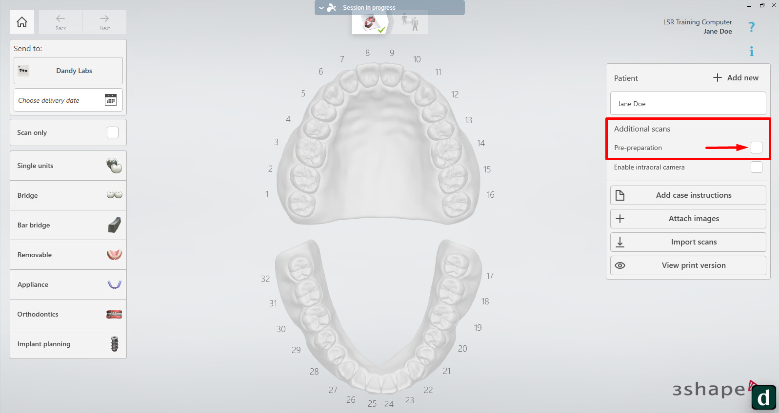 - Check the box to add a pre-prep scan if it's beneficial for aesthetic reasons or to fit a partial or any existing appliance.