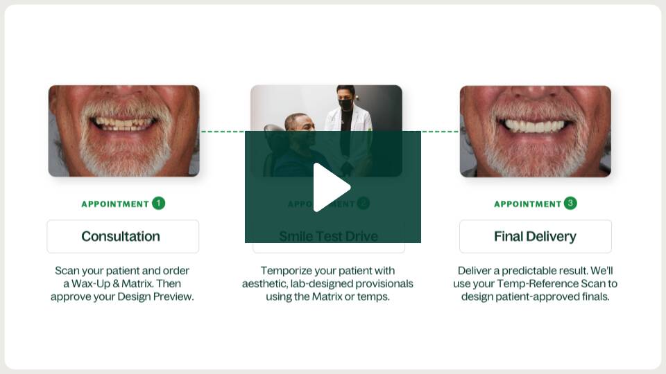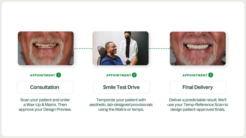 During the first appointment, the clinician scans the patient, captures clinical photographs, and orders a Physical Wax-Up and Matrix.