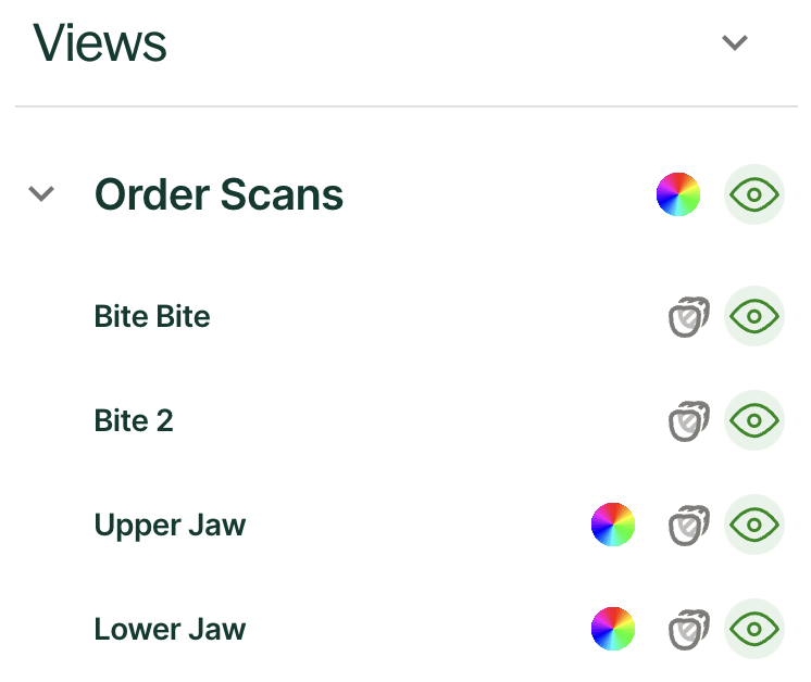 Visibility Toggle (👁️ icon): Show/hide a specific scan layer (e.g., upper jaw, lower jaw).
