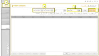 2. Open the Rayscan software and in the “Search” tab, select the correct dates, and type in the patient’s name. Click the orange magnifying glass button to search.