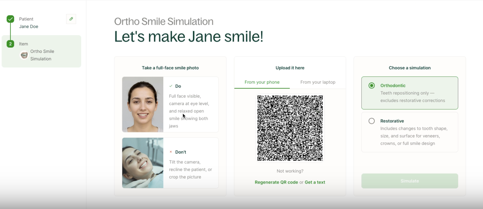 Use the QR code to capture and instantly upload a picture of your patient’s smile. Alternatively, you can upload an image.