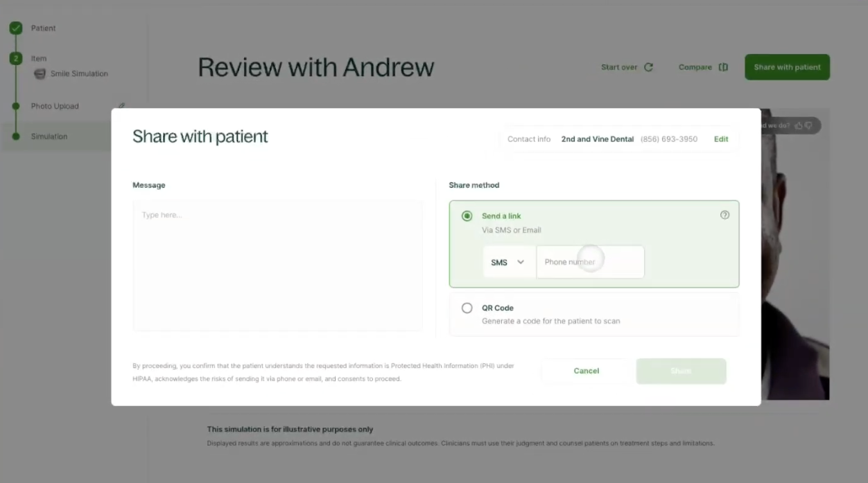 Choose ‘Share with your patient’ and enter your patient’s contact details. This lets you to send the before and after images to their personal devices.