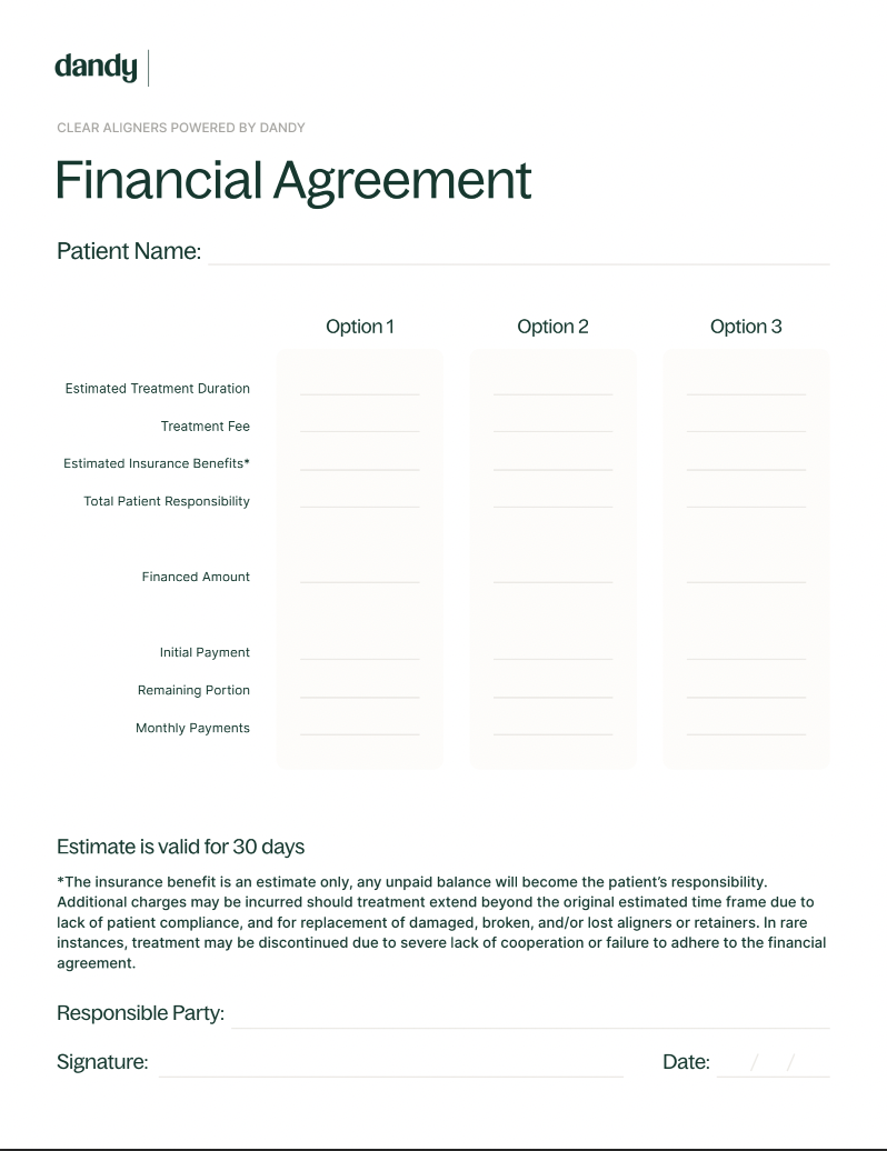 Puede encontrar un ejemplo del Acuerdo Financiero para Alineadores aquí.