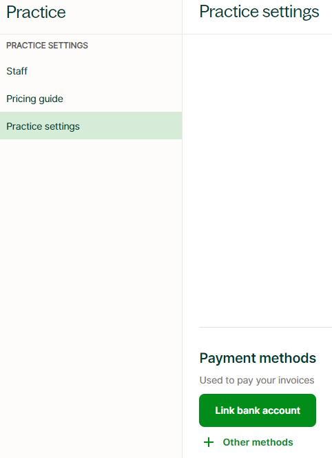 - Si hay varios métodos de pago registrados, vaya a la sección 'Métodos de pago' de 'Configuración de la práctica' para designar su método preferido como la opción principal para las transacciones.