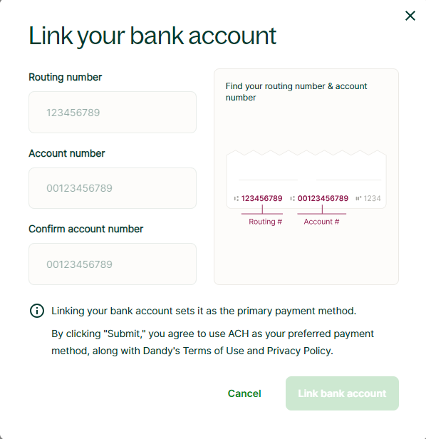 Configurar su método de pago preferido es un paso clave para gestionar sus transacciones en el Portal de Dandy. Esta guía le mostrará cómo agregar una cuenta bancaria y establecerla como su método de pago principal.
