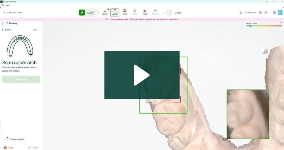 El Modo de Entrenamiento de Escaneo le permite experimentar cómo es el escaneo y seguir un flujo de trabajo de pedido típico sin el riesgo de realizar un pedido. Ya sea que sea odontólogo, asistente o higienista, esta función puede ayudarle a entrenar rapidez y precisión.