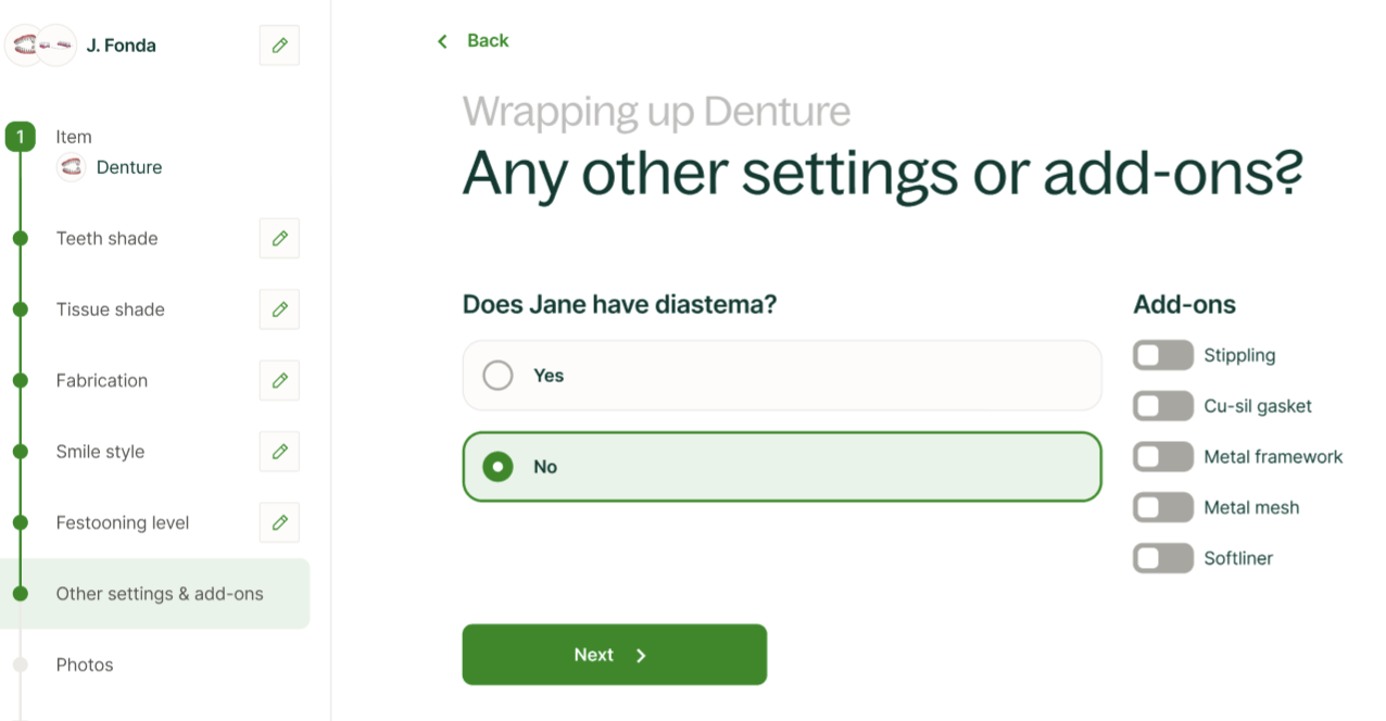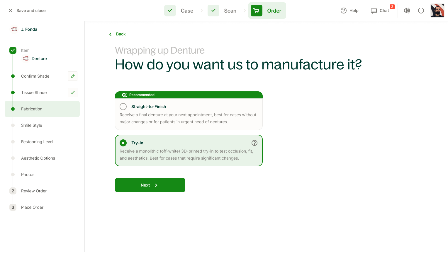 En el flujo de pago para la prótesis dentaria de su paciente, puede fabricar su prótesis directa al acabado final o comenzar con una prueba de ajuste.