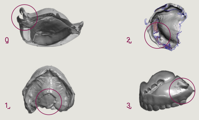 - Escaneo 360 incompleto: este escaneo es inutilizable, ya que no hay escaneo del tejido del paciente, lo cual es necesario para fabricar la base para la nueva prótesis.