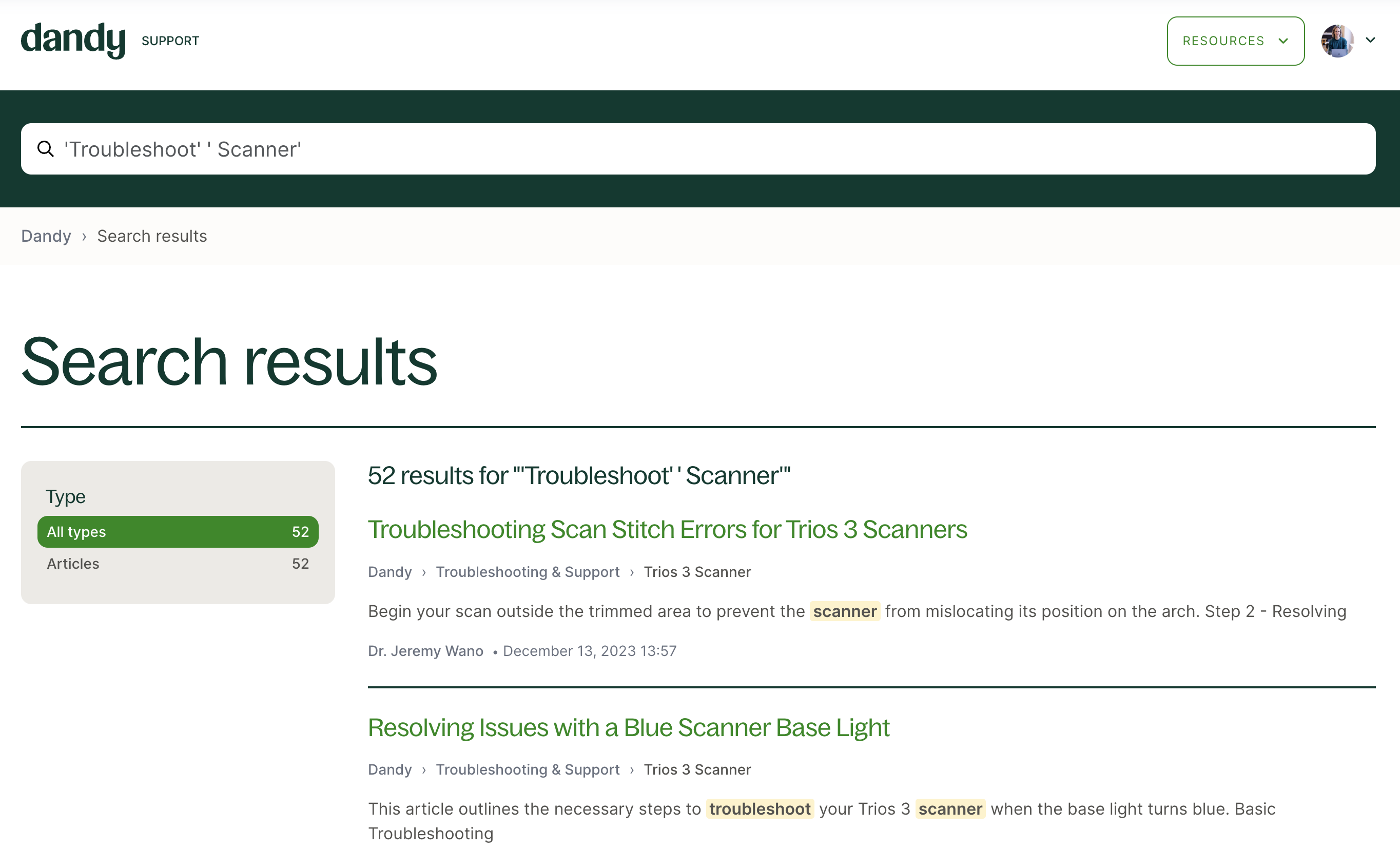 - Use términos específicos relacionados con procedimientos dentales, problemas de software o equipo para obtener resultados más precisos.