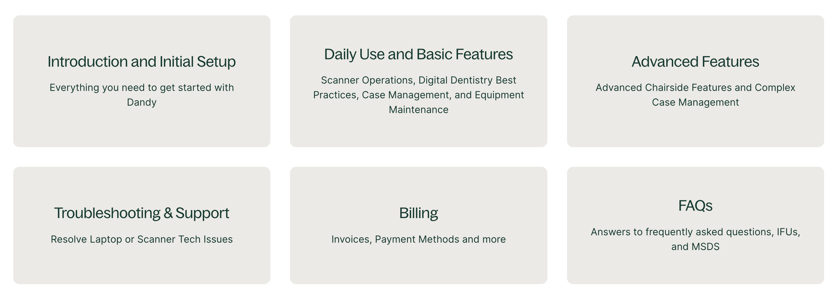 - Las categorías restantes proporcionan la información que necesita para utilizar de forma eficaz el equipo y el software del ecosistema Dandy y responden a las preguntas más frecuentes.