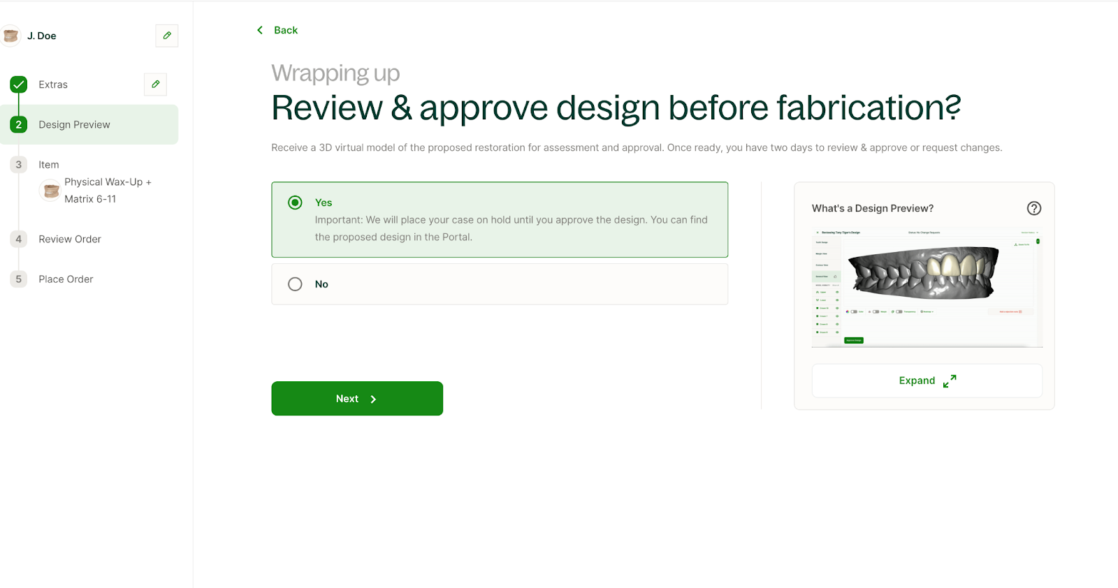 Recomendado: Añadir una vista previa del diseño: Dandy diseñará digitalmente su wax-up y se lo enviará para su aprobación antes de que imprimamos en 3D el Wax-Up físico y la matriz. Esta vista previa del diseño también puede usarse para mostrarle al paciente el resultado final de su sonrisa para que pueda aumentar la aceptación del caso.