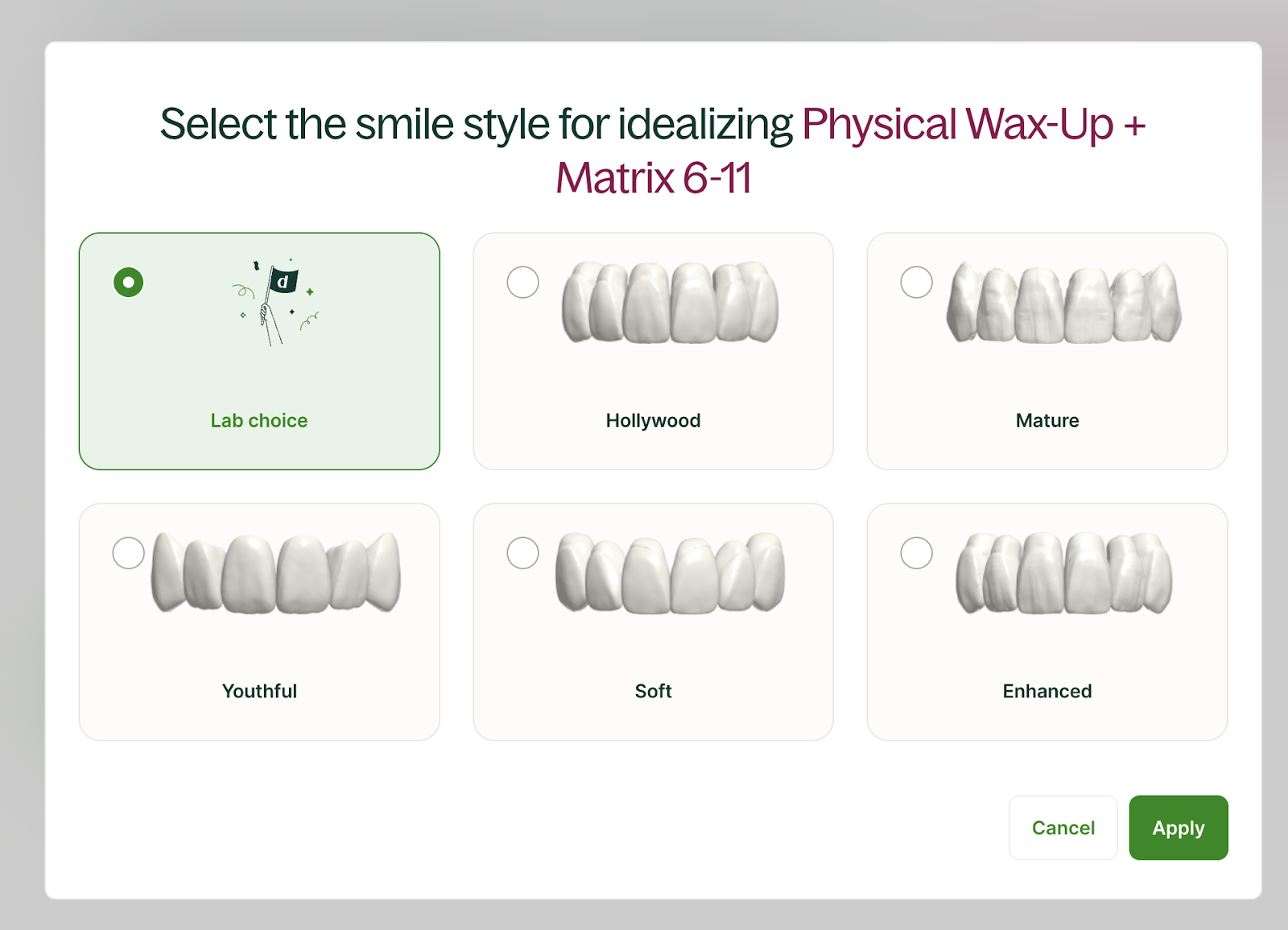 Elija el estilo de sonrisa: Determine qué estilo de sonrisa desea que Dandy diseñe para su paciente.