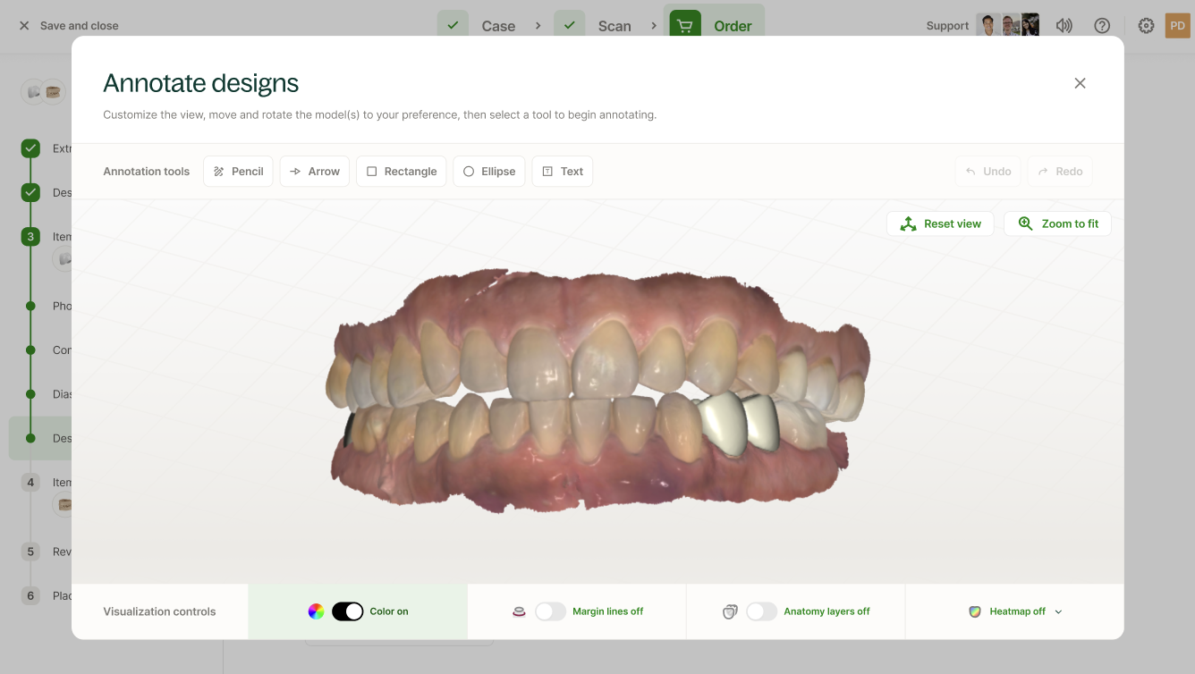 Replicar el wax-up con ajustes: Elegir esta opción abrirá una nueva pantalla que le permitirá anotar el wax-up digital con los cambios que desee ver en las restauraciones finales.