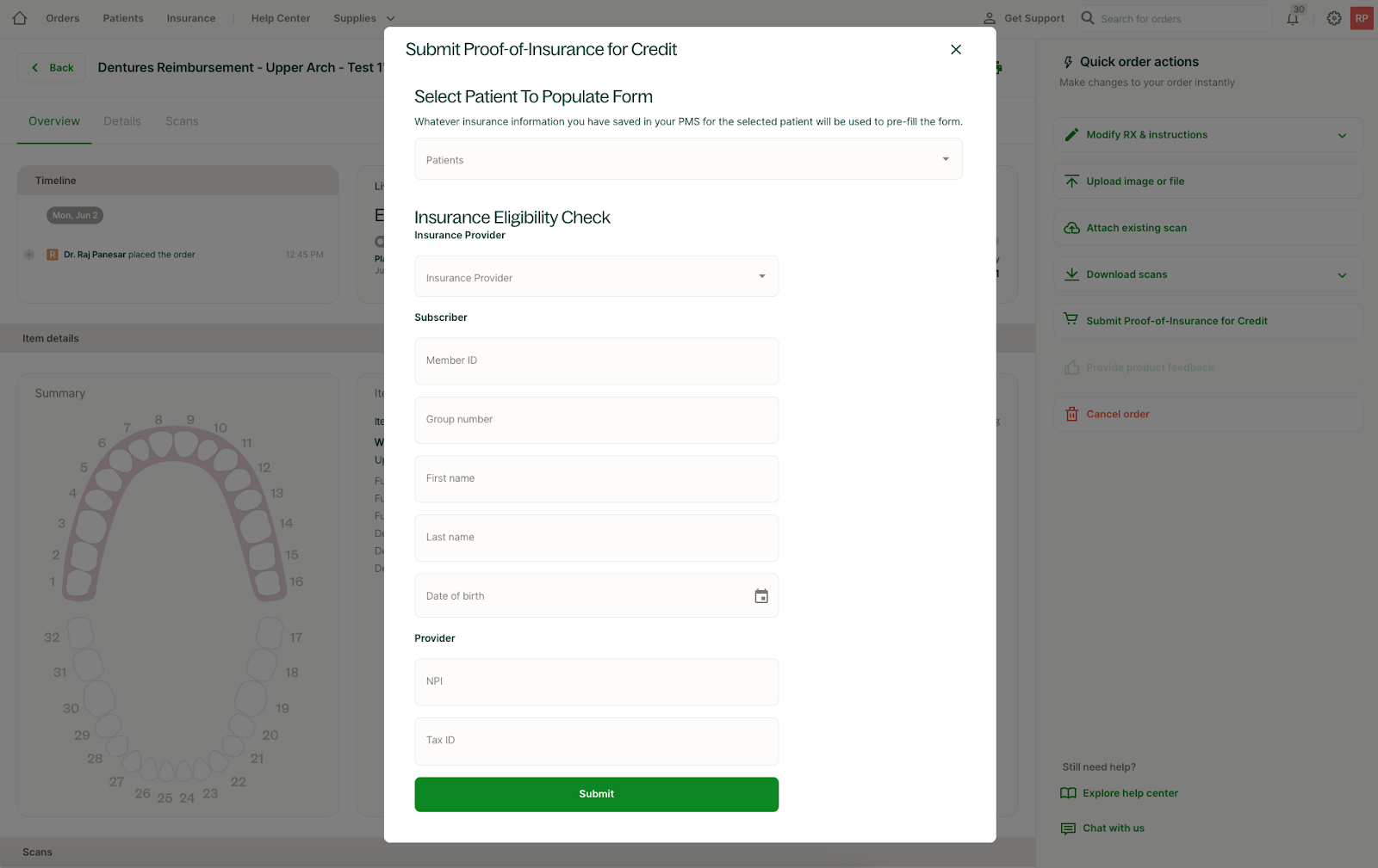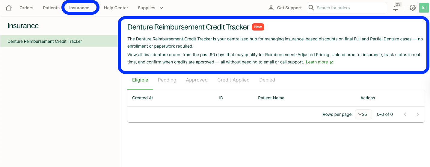 La pestaña Seguros en el Portal de Dandy proporciona un centro centralizado para enviar y gestionar tus casos de dentaduras con precio ajustado por reembolso.